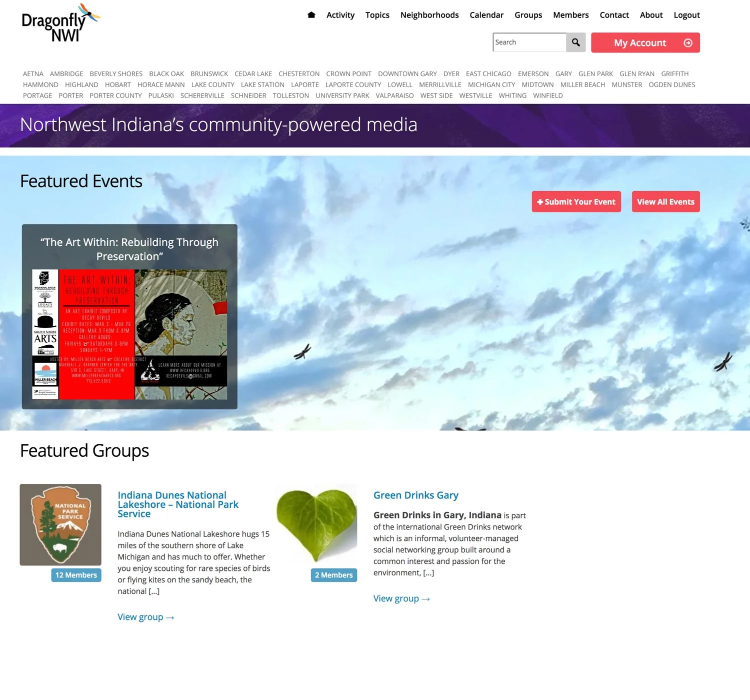 Dragonfly NWI is an Openhill-owned community site for Northwest Indiana featuring events, pics, blogs, articles, and discussions. The site, currently in beta mode, is built off WordPress and extensively customized. At the core is its user-contributed community calendar.